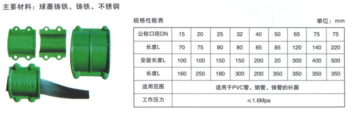 球鐵補漏卡子主要用于管道裂縫和管子出現漏洞時,理想的新型產品,密封料和金屬硫化于一體,只將兩件工件往管道一扣,擰緊螺栓即可。