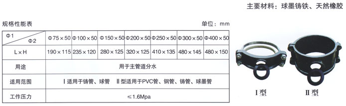 分水卡子用于主管道嫁接分支管道。主要材料:球墨鑄鐵,天然橡膠。適用管道:國標球墨管,鑄鐵管,國標PVC管,PE管。工作壓力:≤1.6MPa。